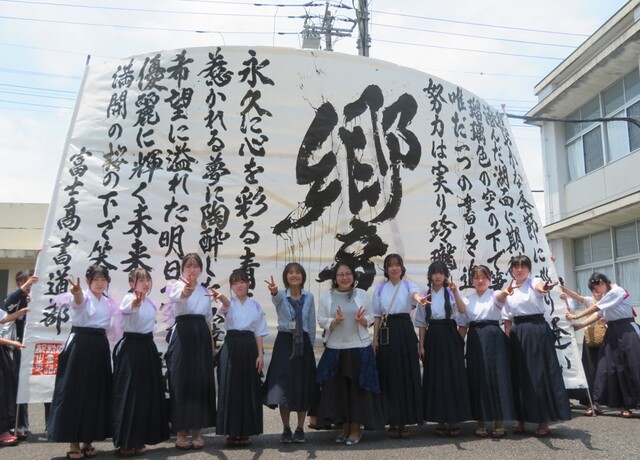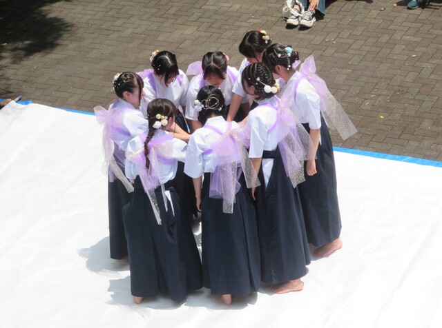 公開日 2025年06月01日 天気に恵まれ、文化の部(一般公開)が実施されています。 写真は、受付での生徒会の生徒の1ショット。そして、中庭では 日差しが差し込む中、多くのギャラリーに囲まれ、書道部3年生の 引退書道パフォーマンスが行われました。3年生8人が円陣を組み、 気持ちを揃えます。3年生の全身全霊、心を揃えた作品が完成です。 3年生の圧巻のパフォーマンスに、ギャラリーからは、温かな拍手が 送られました。 最後に、顧問の先生を入れて、10名でパチッ。