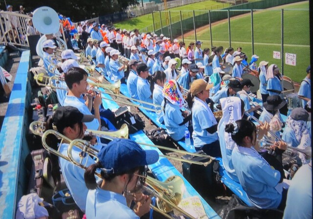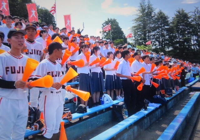公開日 2025年07月17日 7月13日、シード校の本校はいよいよ初戦を迎えました。 スタンドには、多くの生徒、教職員が駆け付け、小学生や保護者や 地域の皆さんの姿があり、地元富士球場で大応援団となりました。 応援団と吹奏楽部の見事に融合された響きに、スタンドの大声援が 加わり、グランドの選手たちを後押しします。 試合は5-2で勝利。選手とスタンドに笑顔の輪が広がりました。 富士球場には、富士高の校歌が響き渡りました。