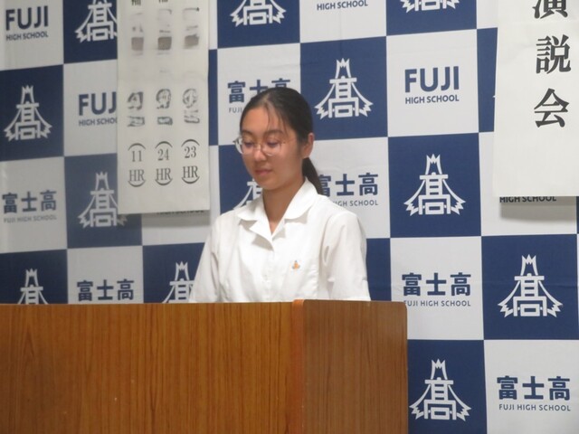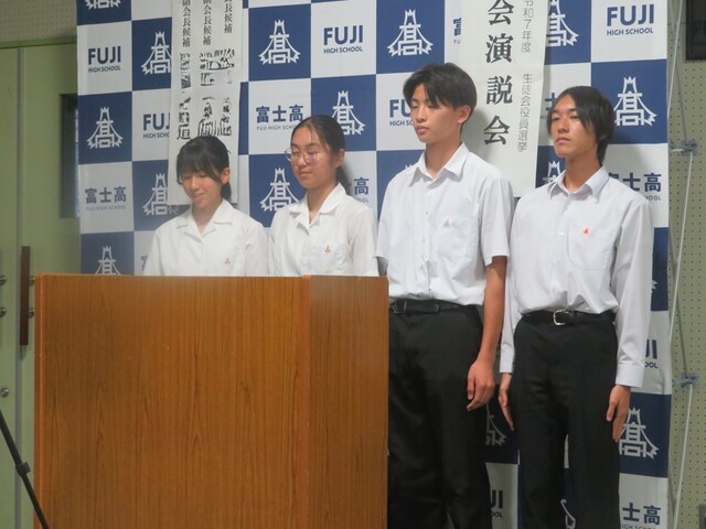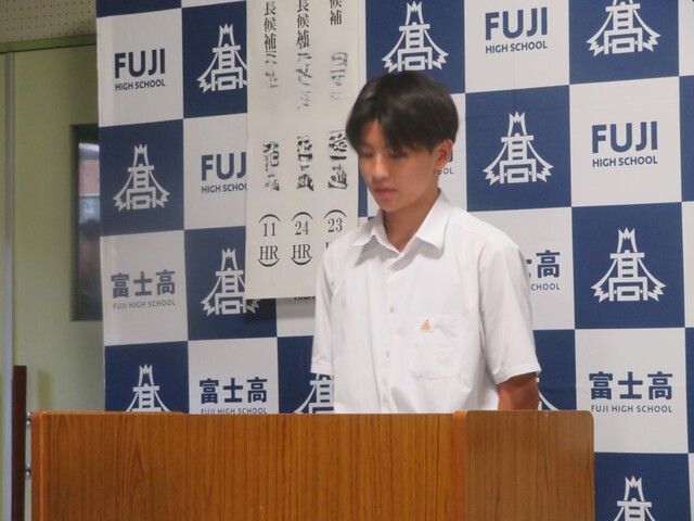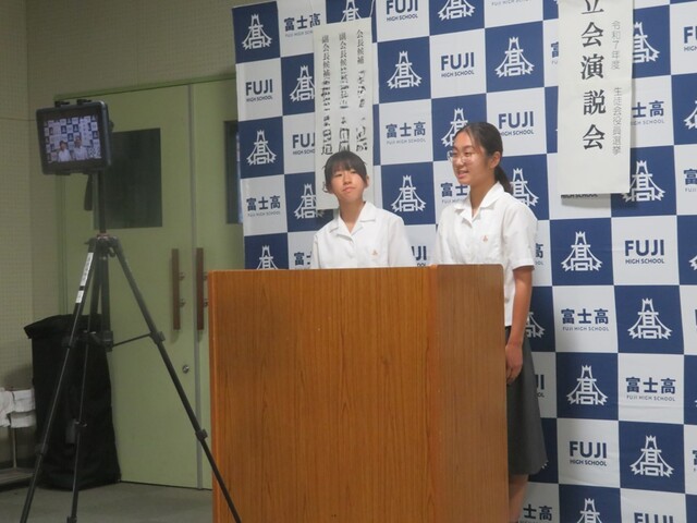 9月18日の7限目に、立会演説会が行われました。視聴覚室から各教室へのリモート配信での実施となりました。まずは、選挙管理委員の紹介、流れの説明の後、副会長候補の斎藤さん、会長候補の芹澤さんからそれぞれ、思いのこもった演説がありました。さすが富士高生、富士高校をより良くしていきたいという気持ちがあふれ出た素晴らしい演説でした。生徒会長候補の芹澤さんは、最後に選挙管理委員長から読まれた、事前に寄せられた「富士高生からの質問事項」一つ一つに丁寧に回答してくれました。富士高生が作り上げる未来の富士高校が楽しみです。