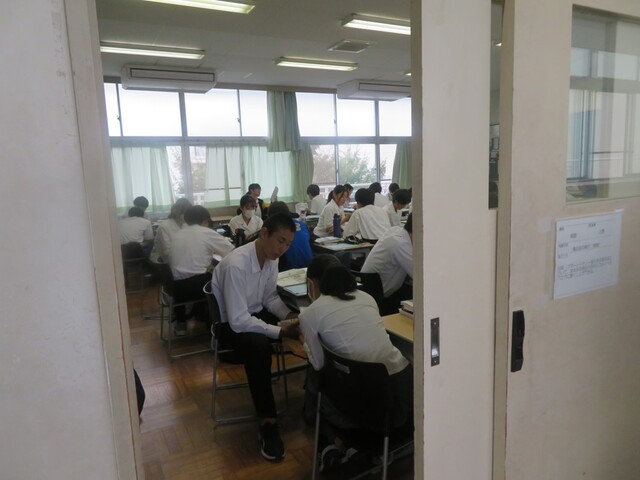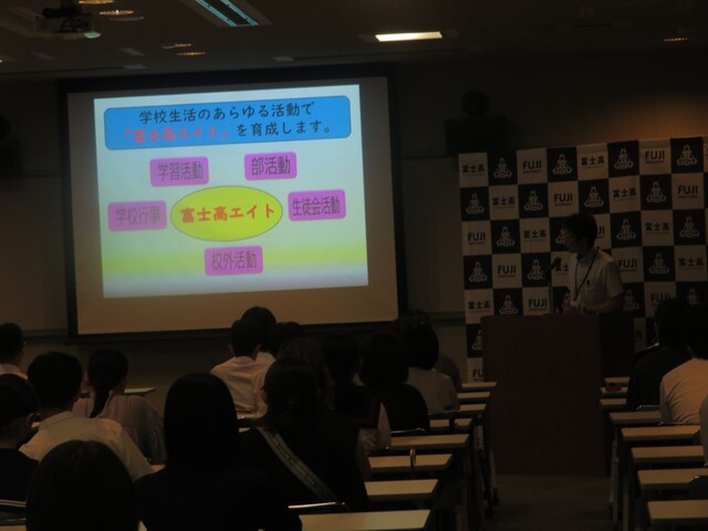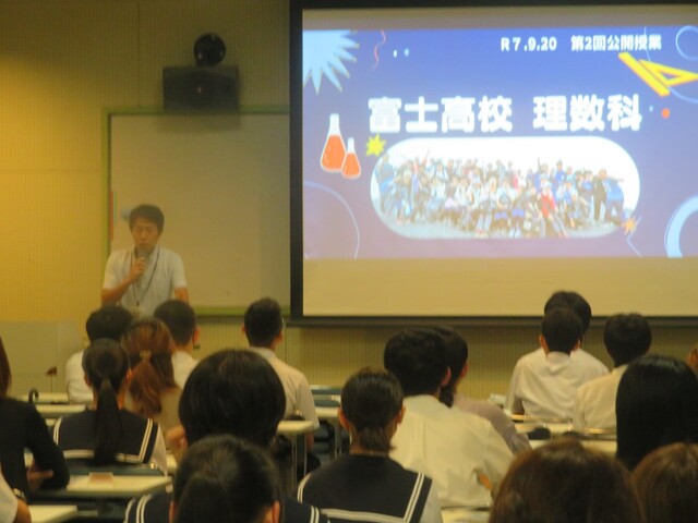 9月20日は、第2回学校公開日でした。多くの中学生、中学生の保護者、本校生徒の保護者がご来校くださました。ありがとうございます。写真は、視聴覚室での全体説明、理数科説明の様子です。生徒ホールの展示物や映像紹介のモニターに足を止め、多くの方々が談笑しながら見てくださいました。各教室で行われた授業も、教室内外で多くの方が見学している姿がありました。放課後は、部活動見学で生徒たちが活動する生の姿を見ていただきました。富士高校の魅力、富士高生の魅力の一端を感じ取る機会となっていたら、嬉しく思います。