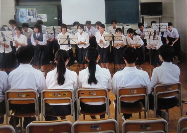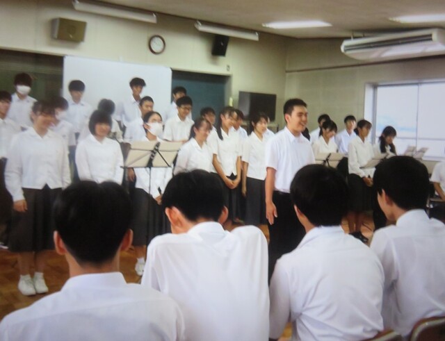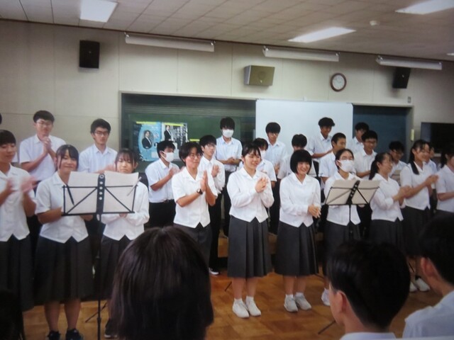 公開日 2025年10月07日 10月6日、音楽室では、1年生選択音楽の授業で、身体を使ったリズム打ち(ボディパーカッション?)の発表会が行われていました。先生方や他の選択(美術、書道)の生徒たちの前で、各チームが準備してきたリズムを披露してくれました。「たけのこニョキニョキ」や「大地を踏みしめる」などのテーマに沿ったリズムを、それぞれのチームが「笑顔」で「一体感」を持って、発表してくれました。見ていた人たちからは感嘆の声と大きな拍手が送られました。