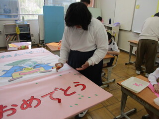 最初に1年生がどうしたら喜んでくれるかを考えました。会が進行していくにつれて、プログラムボードから「おめでとう!」の文字が出てくるようにしたり、1年生の好きなキャラクターや顔写真が見えてくるようにしたりと、それぞれの児童が考え、会を成功させようと準備から頑張りました。