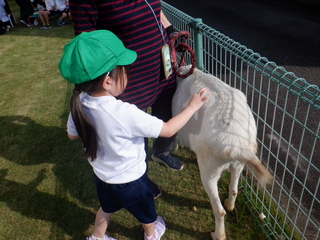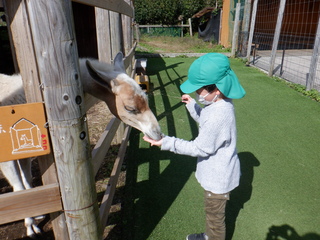 学校でぬいぐるみ等を使って「やさしくさわる」ことや「ては パー」でえさやりをすることなどの練習を重ねたり、中庭で本物のヤギにえさやりをする経験をしたりしたおかげで、当日も落ち着いて自分から手を伸ばし、動物との触れ合いを楽しむ姿がたくさん見られました。