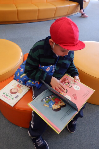 図書コーナーに移動すると、たくさんの本の中から、好きな本を選びました。中には、「食べ物の本はどこにありますか?」と、自分の探している本の場所を職員の方に尋ねる人もいました。