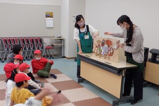 図書館では、職員の方に「まどからおくりもの」と「もりのおふろ」の大型絵本を読み聞かせしていただきました。みんなが大好きな本ということもあり、よく聞いていました。