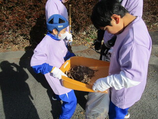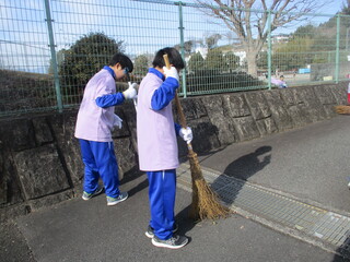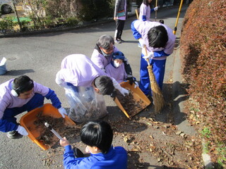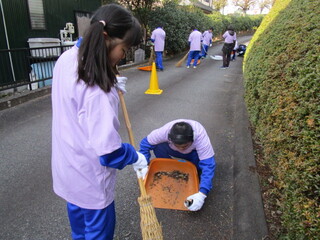 公開日 2026年01月15日 総合的な学習の時間で『大淵クリーン作戦』を行いました。中学部のみんなでグループに分かれ、竹ぼうき、手箕などを使って学校周辺の清掃活動をしました。 1年生は、秋に実施した『こどもの国』の落ち葉清掃で学んだことを生かし、チームで役割分担をしたり、声を掛け合って協力したりして作業をすすめることができました。 たくさんの落ち葉やごみを拾い集め、大淵地区をきれいにすることができました。