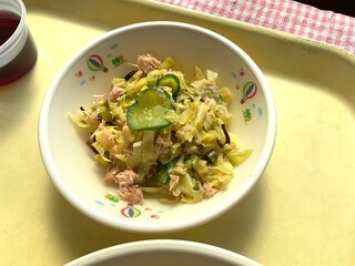 富士農林事務所主催の高校生による給食コンテストで惜しくも入賞にはなりませんでしたが、応募した料理の中から「塩昆布キャベツ」を取り入れました。地場産物のキャベツを、ツナと、塩昆布、ごま油で合わせています。給食でも、塩昆布和えはありますが、ツナを入れたところが新しい!と思って採用しました。