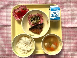 本校では、テーマ食品5つのうち「さば、チンゲンサイ」の2つを使用しました。また、あわせて、富士宮の有機野菜(大根、人参、里芋、ねぎ)や、富士市のいちごも使用し、地域や県内の食べ物いっぱいの給食を味わいました。