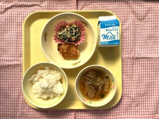 公開日 2026年02月26日 【今日の献立】 ご飯 牛乳 鶏肉のみそ焼き 白和え 白菜のすまし汁 鶏肉のみそ焼きは、酒で下味をつけてから蒸し焼きにした後、出てきた水分を取り除き、みそだれを塗って、再度オーブンで焼き上げています。このひと手間をかけることで、みそも焦げすぎずに、しっとりジューシーに焼きあがります。手間を惜しまず作ってくださる調理員さんに感謝です。 今日のような和食は、みんな大好き!笑顔で、おいしそうに食べていました。
