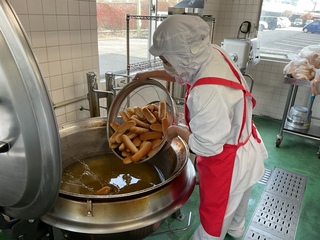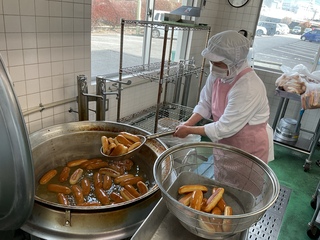 公開日 2026年03月06日 【今日の献立】 揚げパン 牛乳 ポークパオズ かぼちゃサラダ ポトフ 2月の献立表を配った時から、楽しみにしていた子も多い「揚げパン」です。 給食室の大きな回転窯で、約650本のロールパンを揚げます。パンが油っぽくならない様に揚げるのは、まさにプロの技! カリッと揚げたパンには、ミネラル豊富で、サトウキビの持つ自然な風味とコクがギュッと詰まった、きび砂糖をまぶしました。