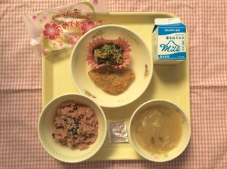 公開日 2026年03月06日 【今日の献立】 お赤飯(ごま塩) 牛乳 かつおフライ ほうれん草のごまあえ きのこのみそ汁 お祝いクレープ 今日は、高等部3年生、中学部3年生、小学部6年生の卒業をお祝いした給食です。 お祝いの食事には欠かせないお赤飯。日本では、赤い色は邪気を払うと考えられており、厄払いや魔よけの意味をこめて、祝いの席にお赤飯がふるまわれるようになったそうです。 高等部3年生にとっては、12年間食べてきた給食もあと1日。最後は、高等部3年生のリクエスト献立です!