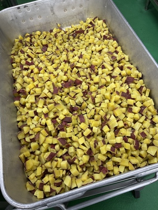 「栗かぐや」という品種で、給食では初登場です。蒸すと、きれいな黄金色になり、ほどよいホクホク感と甘みが特徴のさつまいもです。