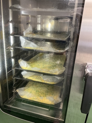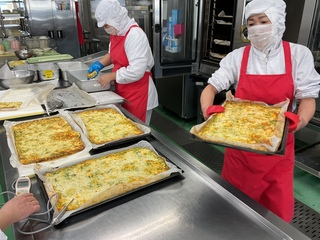 給食では、一つ一つオムレツを作ることは難しいので、天板に卵液をひき、ねぎとチーズをちらして作りました。