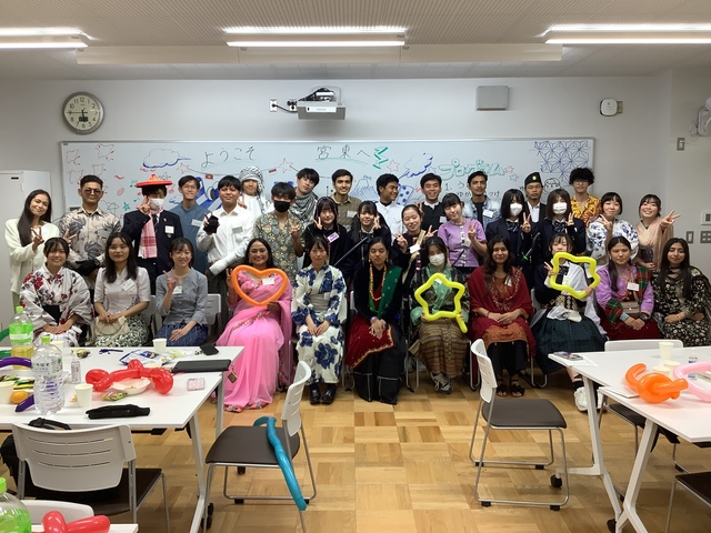 11月6日(木)、A.C.C国際交流学園の学生と一緒に、宮東の国際交流である、「インターナショナルカフェ」を行いました。テーマは民族衣装。A.C.Cの学生さんたちは、母国の民族衣装で参加、宮東生は浴衣やアジア、中東の民族衣装で参加しました。自己紹介の後、オススメお菓子を食べたり、バルーンアートを行ったりして交流を深めました。