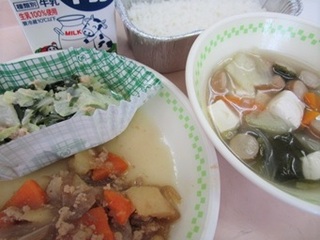 ごはん 牛乳 そぼろ肉じゃが わかめとツナのサラダ 豆腐スープ