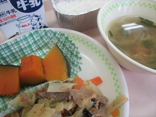 ごはん ホイコーロー かぼちゃの煮物 にら玉スープ