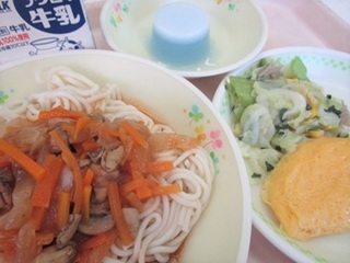 公開日 2025年06月17日 6月17日(火)ふるさと給食週間2日目 ~静岡県~ ソフトめんフレッシュトマトのナポリタンソース 牛乳 オムレツ キャベツとチンゲン菜のソテー 富士山ゼリー 県内産のトマトをたっぷり使ってナポリタンソースを作りました♪