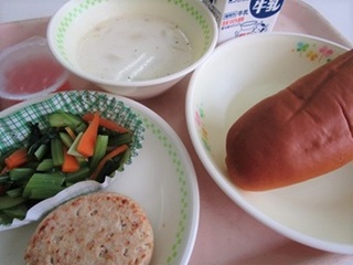 公開日 2025年06月26日 6月26日(木)の給食 黒糖入りパン 牛乳 豆腐ハンバーグ 小松菜サラダ じゃがいものポタージュ ももゼリー じゃがいものポタージュはじゃがいもが煮溶けるようにじっくり煮て作りました。