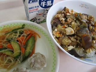 マーボーなす豆腐丼 牛乳 肉しゅうまい 春雨サラダ