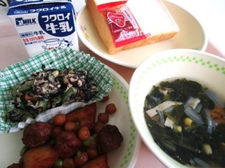 公開日 2025年07月17日 7月17日(木)の給食 パン 牛乳 ジャム 肉団子とじゃがいものケチャップソース和え ひじきたっぷりサラダ ほうれん草スープ 素揚げした肉だんごとじゃがいもをひよこ豆を入れたソースで和えて仕上げました。