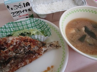 ごはん 牛乳 いわしのかば焼き カレードレッシングサラダ みそ汁