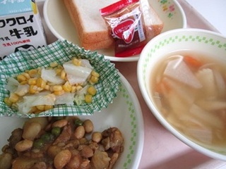 公開日 2025年09月11日 9月11日(木)の給食 パン 牛乳 いちごジャム とり肉と大豆のカレー煮 コーンサラダ ラビオリスープ とり肉と大豆のカレー煮は野菜をよく煮込んで作りました。 カレー味が好評のようでした♪