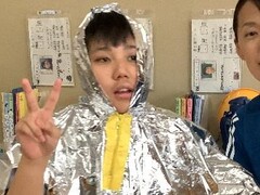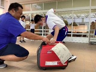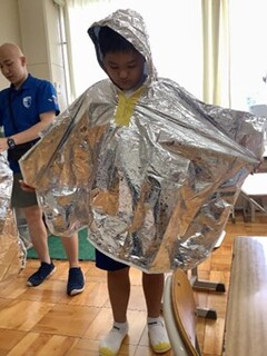 体温を守るアルミ製のポンチョを着たり、発電機を使い扇風機を回したりして、もし停電になったらどうするかを考えて体験しました。