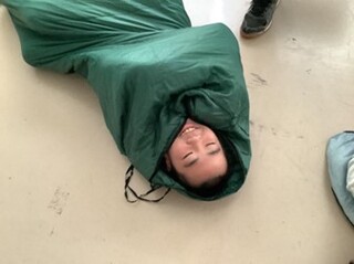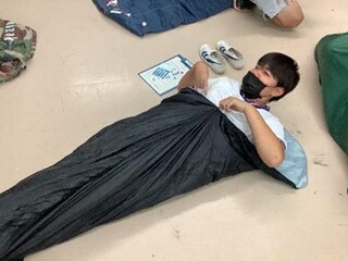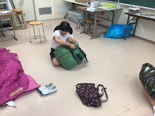 また、防災バッグの中身を確認した後に寝袋体験をしました。広げて入ることは慣れた様子でしたが、片づけにはなかなか苦戦している生徒が多かったです。