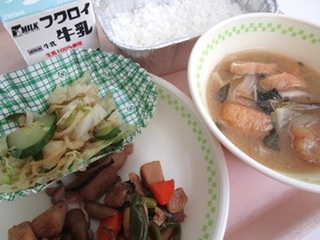 ごはん 牛乳 炒りどり たくあんのパリパリ和え みそ汁