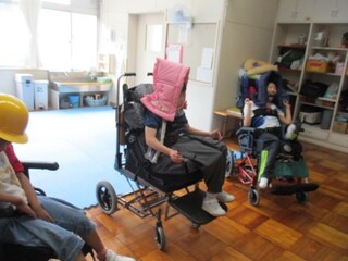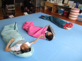 公開日 2025年10月02日 高等部5組 9月 ロングホームルーム 「災害時の生活を体験しよう!」 高等部5組では、防災ウィークに「災害時の生活を体験しよう!」ということで、地震の音を聞いて防災頭巾やヘルメットをかぶったり、寝袋体験をしたりしました。地震の音に怖がる生徒もいましたが、落ち着いて行動することができました。