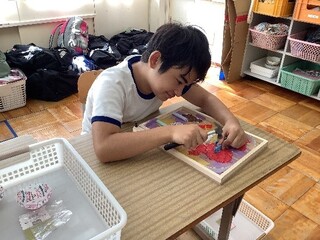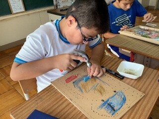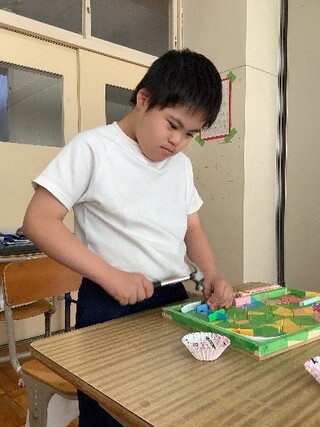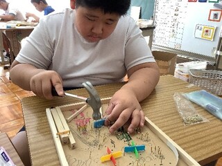 公開日 2025年10月02日 小学部6年生 9月 図工「コリントゲーム」 9月の図工では、修学旅行で行く「レゴランド」や「水族館」をテーマに、コリントゲームを作りました。初めて扱う金づちや釘に苦戦しながらも、繰り返し取り組むことでこつをつかみ、集中して取り組む姿がたくさん見られました。