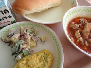 パン 牛乳 チキンビーンズ ほうれん草オムレツ 秋のサラダ