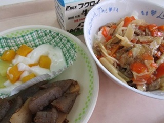 中華丼 牛乳 こんにゃく炒め フルーツ杏仁