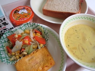 公開日 2025年10月30日 10月30日(木)の給食 黒糖入りパン 牛乳 ハムチームピカタ フレンチサラダ かぼちゃのミルクスープ ハロウィンババロア ハロウィンにちなんでかぼちゃを使ったスープとパンプキンババロアの給食でした。