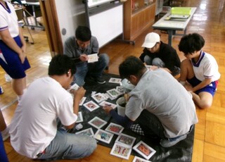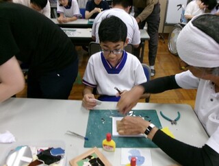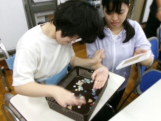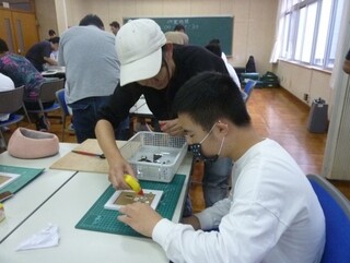 【タイル煉瓦工事協会 技能士会】より7人の講師が来てくださりました。タイルの割り方や付け方などの説明を受けてから作り始め、自分で選んだイラストを見ながら下絵にタイルを張って野菜やボールなどを描いたり、花やハート、四角などに型どられたタイルを自由に組み合わせて張ったりして作品を作ることができました。作り終わった後は、「自分が思ったようにタイルを割るのが難しかった!」や「タイルを上手に張れて嬉しかった!」などの声が聞かれました。