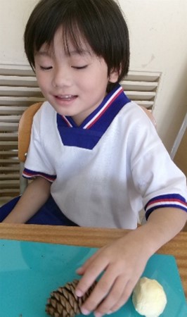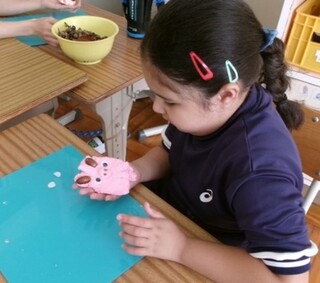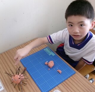 公開日 2025年11月07日 小学部1年 図画工作 「粘土で作ろう。」 紙粘土を使って、生き物を作りました。 手の平で紙粘土を握ったり丸めたりして、動物の顔や体の形を作りました。耳や鼻、足などのパーツを、どんぐりや松ぼっくり、枝を使って付け、「ブタ」や、「鳥」、「ライオン」などを作りました。
