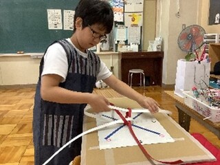 自分で選んだ紙バンドを使って、色の組み合わせを工夫しながら製作しています。光る子まつりに来てくださるお客様を笑顔にするために、丁寧に心を込めて作業しています。