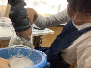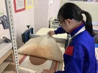 紙工班では、はがし、ちぎり、ミキサー、紙すきなど一人ひとりが複数の工程に取り組んでいます。光る子まつりでは、お客様に喜んでもらえる製品を作るために、「穴がない」「しわがない」「ごみがない」製品を目指して、製品作りに取り組んでいます。作業台や道具の運搬などの準備もリーダーが中心となって、みんなで協力して作業しています。