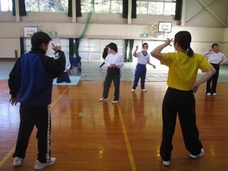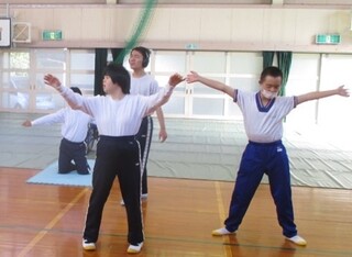 エアロビクスでは、講師の先生のまねをしながら、音楽に合わせて全力で体を動かしています。