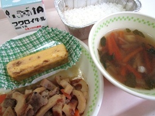 ごはん 牛乳 かつおツナ入り厚焼き玉子 大根とぶた肉のみそ煮 沢煮わん