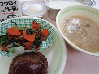 公開日 2025年12月10日 12月9日(火) 小学部1年生リクエスト給食 ごはん 牛乳 ハンバーグ 磯香和え みそ汁 プリン 「ハンバーグ・にんじんが入ったあえもの・デザートが食べたい!」 1年生のリクエスト給食でした。
