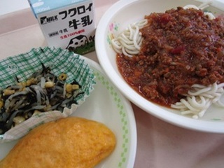 ソフトめんミートソース 牛乳 オムレツ ひじきサラダ