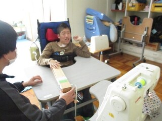公開日 2025年12月18日 高等部5組 11月 学習の様子 高等部5組では、光る子まつりのプレゼント渡しのために、くるみボタンを使った缶バッジやキーホルダーなどを製作しました。使いたい色の糸を選んだり、ミシンで布に模様を付けたりしました。当日は用意したプレゼント、すべて手渡しすることができました。