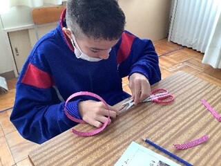 公開日 2025年12月18日 小学部6年 12月生活単元学習「なるぞ、スーパー中学生!」 12月の生活単元学習では、中学部を見学して、小学部と中学部の違いを見つけたり、中学部のことについて質問をしたりして、調べ学習に取り組みました。また、紙工班、縫工班、紙バンド班の作業体験もしました。 調べ学習や作業体験を通して中学部について知り、中学部になることを楽しみにしたり、中学部に向けて頑張ることを考えたりすることができました。