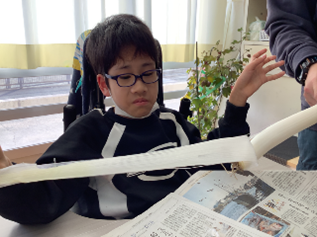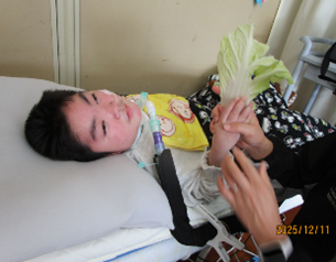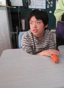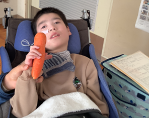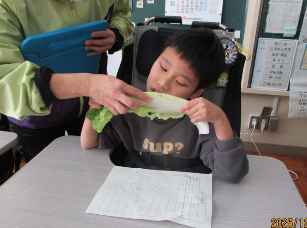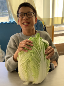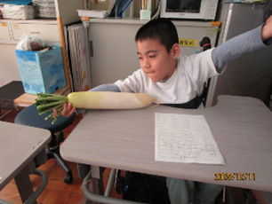 公開日 2026年01月07日 小学部5組 12月の学習の様子 小4~6年 特別活動【我が家のお鍋】 食育について学習を行いました。『我が家のお鍋』というテーマで自分たちの家のお鍋を発表したり、お鍋に入れる野菜の感触や匂いを感じたりしました。実際の野菜を見て「大きい。」と驚いたり、野菜の感触に表情を変えたりする姿が見られました。