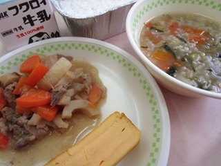 ごはん 牛乳 厚焼きたまご 大根とぶた肉のみそ煮 七草汁