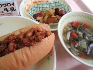 パン 牛乳 チリコンカーン アップルポテト 白菜スープ