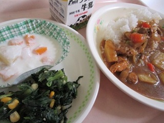 チキンカレーライス 牛乳 小松菜サラダ フルーツヨーグルト