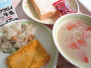 パン 牛乳 ジャム ハムチーズピカタ 大根サラダ 豆乳シチュー