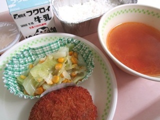 ごはん 牛乳 野菜コロッケ コーンサラダ 大豆とトマトのスープ プリン